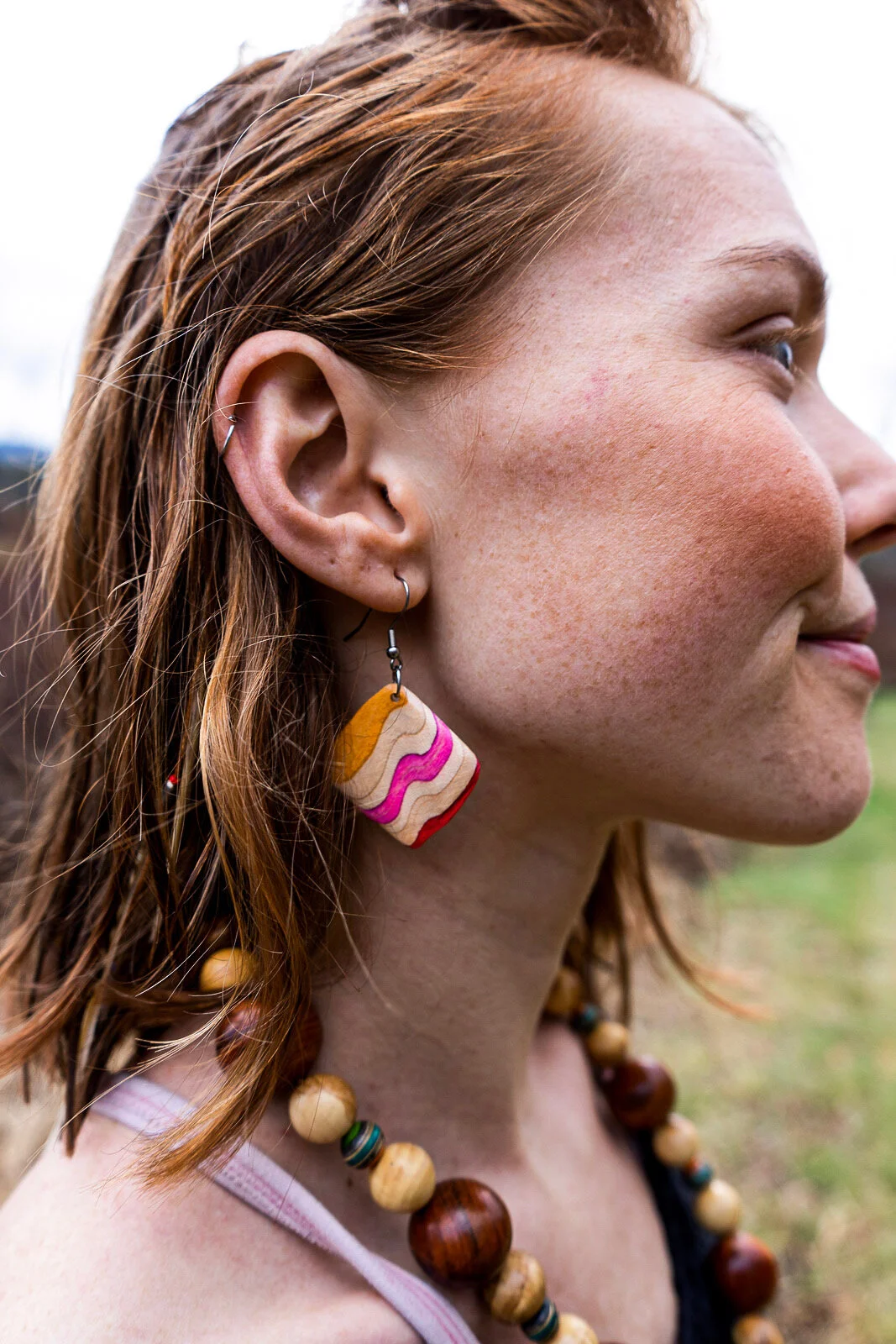 live edge maple dangle earring and handmade bead necklace created by Vermont Creative Reed Prescott