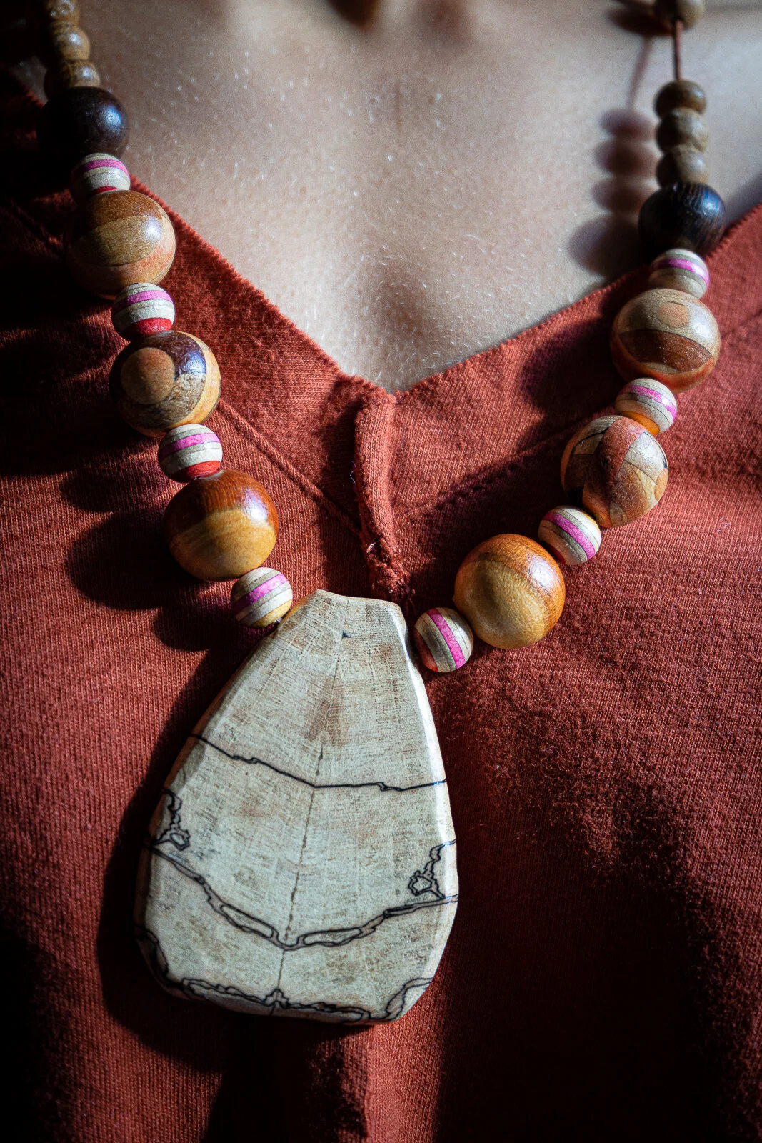 we glue those small wood scaps most woodworkers burn and cut them into one of a kind handmade in Vermont wooden bead like the ones in this necklace