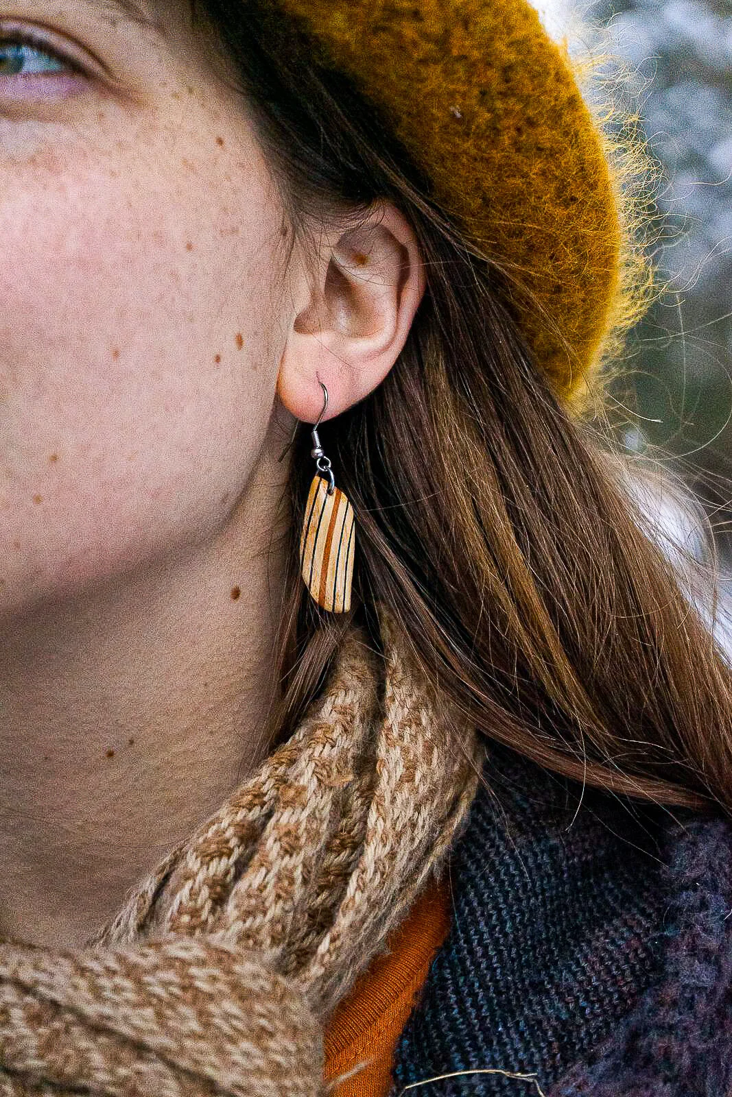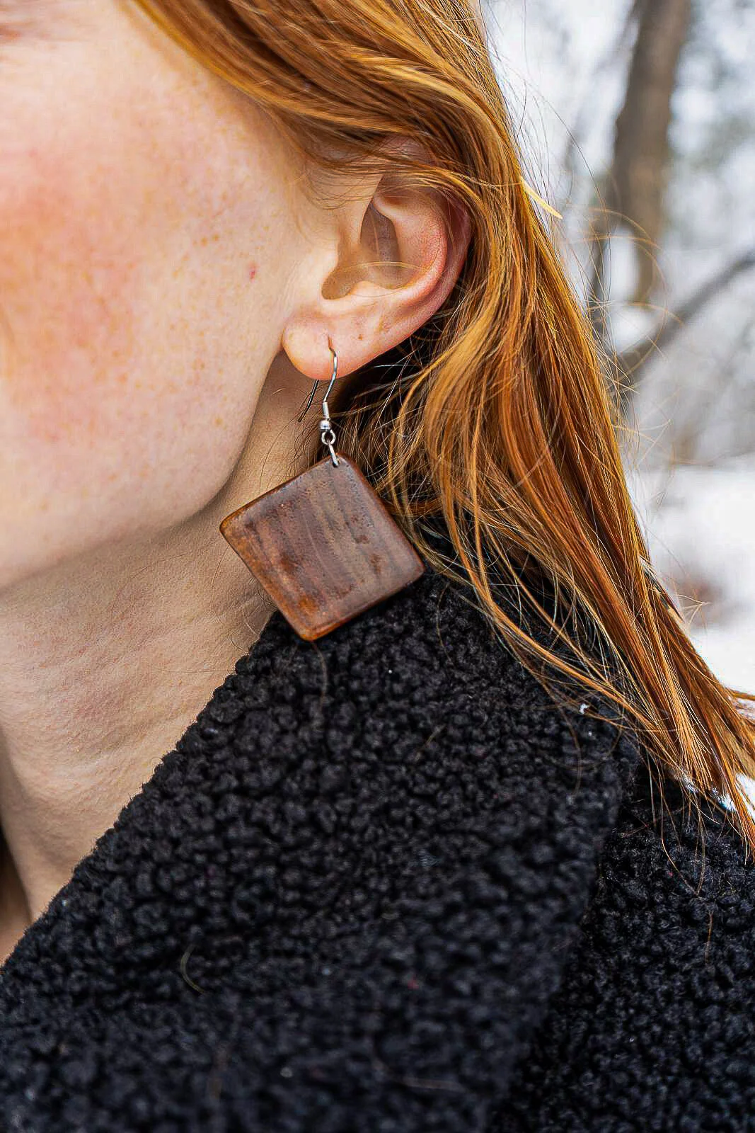 these lightweight earrings made from cherry burl resin and oak repurposed from a mad river distillery whiskey barrel